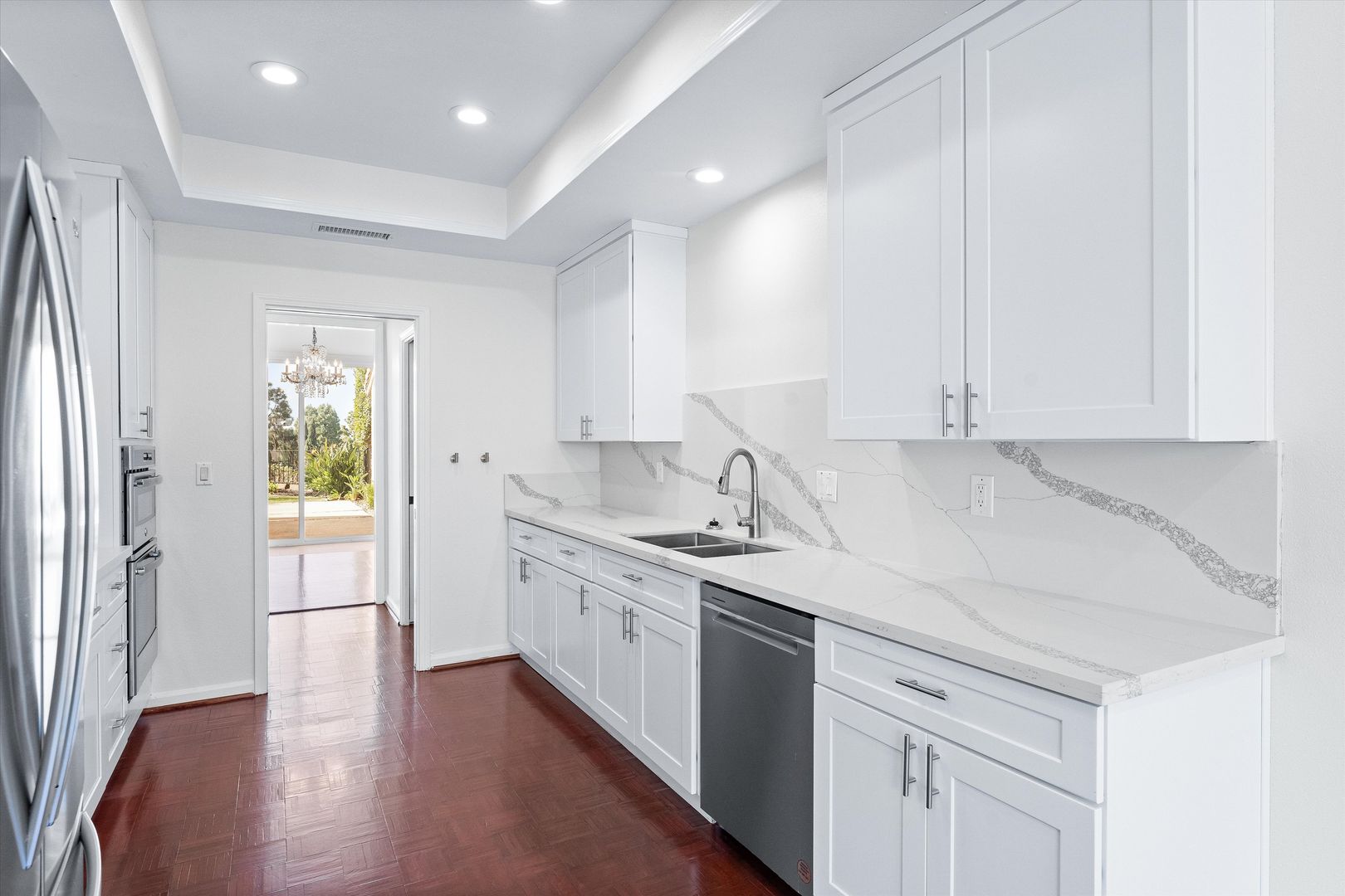 Located in the prestigious guard-gated Big Canyon community of Newport Beach, this home offers a perfect mix of luxury and tranquility. Ideally located, you're just minutes from the best shopping and dining at Fashion Island, with easy access to beautiful spots like Balboa Island, Back Bay, and the Peninsula. Step inside, and you'll find the main level featuring stylish travertine and parquet flooring. The remodeled kitchen is both modern and welcoming, with brand-new cabinets, stainless steel appliances, and a cozy breakfast nook. The spacious living room boasts high ceilings and plenty of windows, flooding the space with natural light and creating an open, airy feel. The ground-floor primary suite is a peaceful retreat, with a large sliding glass door that opens to the serene backyard. The ensuite bathroom is designed for relaxation, offering a spacious closet, separate shower, deep soaking tub, dual sinks, and elegant finishes. For added convenience, there’s a half bath and laundry room on the main level. Upstairs is two additional guest bedrooms along with a shared guest bathroom. The attached three-car garage provides plenty of storage space. The backyard is a private oasis, ideal for relaxing or entertaining, with no neighbors directly behind, adding to the sense of peace and privacy.